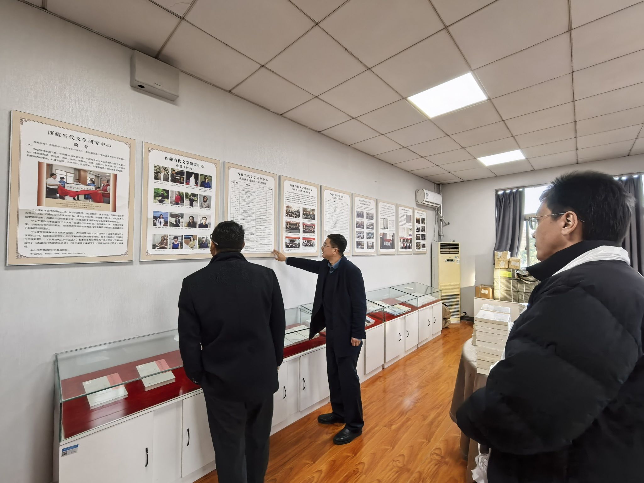 在王军君院长的带领下,贺玺浦副主任一行先后参观了文学院书法实训室、藏戏艺术展示厅、西藏当代文学研究中心以及期刊阅览室等教学科研场地。实地查看过程中,王军君院长详细介绍了各场地的功能定位、使用情况及特色资源,重点展示了文学院在西藏文学、藏戏文化传承、书法艺术教学等领域的育人成果。