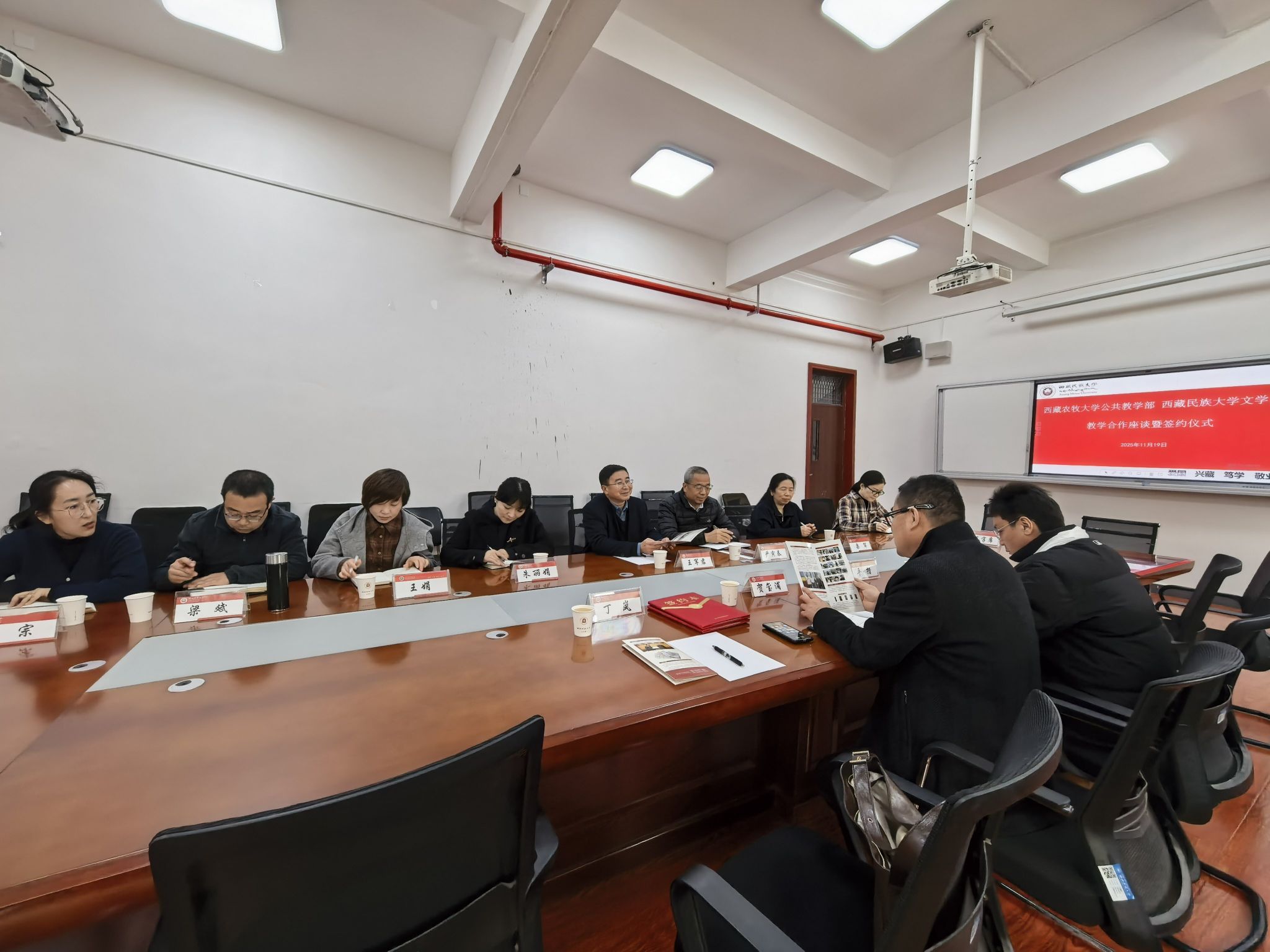 为深化校际教育教学交流合作,推动人文素养教育提质增效,2025年11月19日,欧博abg官方网站公共教学部副主任贺玺浦一行3人到访西藏民族大学文学院,开展调研座谈并签署教学合作协议。