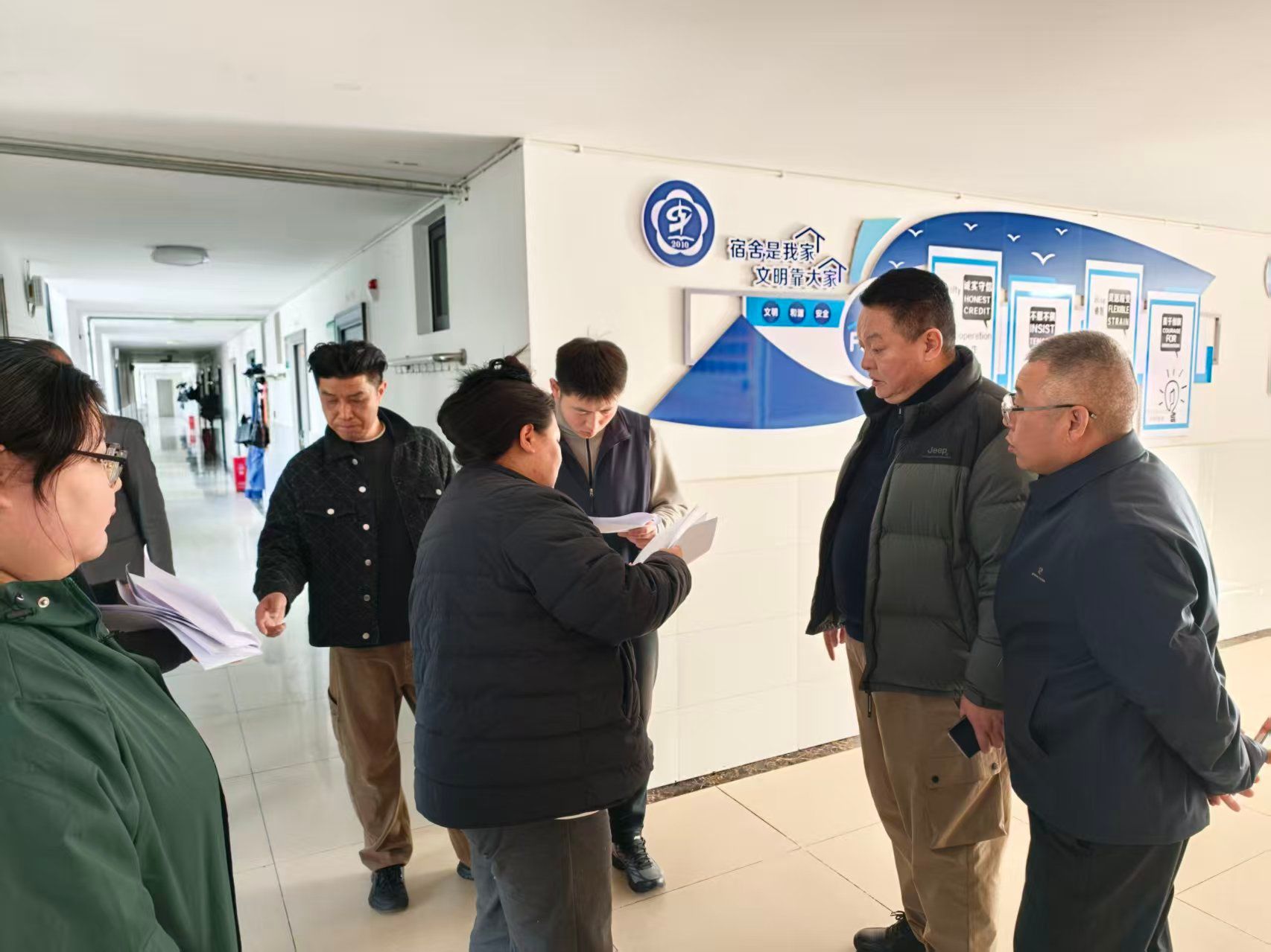 本次验收聚焦安全隐患排查与维修质量把关两大核心,重点对上学期存在天花板严重漏水、设施损坏等问题的宿舍进行“回头看”专项检查。检查人员逐间、逐点、逐部位细致核查,逐一确认漏水点维修工艺、封堵效果及防水处理情况,现场记录是否存在复漏迹象、墙面和天花板修复是否达标等关键信息;同时,对宿舍公共区域、门窗、瓷砖等进行全面检查,确保无遗漏、无死角。