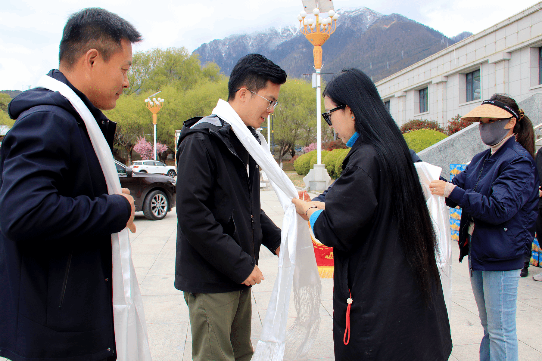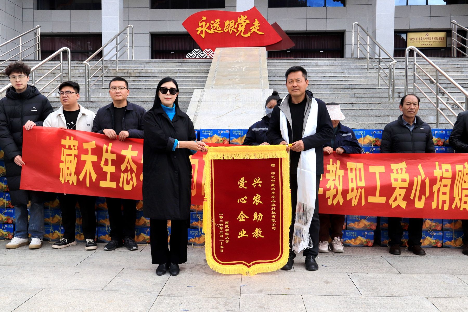 最后,贾海娥副主席代表学校向藏禾生态农业科技有限公司送上了一面锦旗,为亲自送水果番茄的郭启松经理和工作人员敬献了哈达,以表达对爱心企业履行社会责任、支持教育事业的深深敬意。企业方与校工会共同为各分会发放了爱心水果番茄并合影留念。