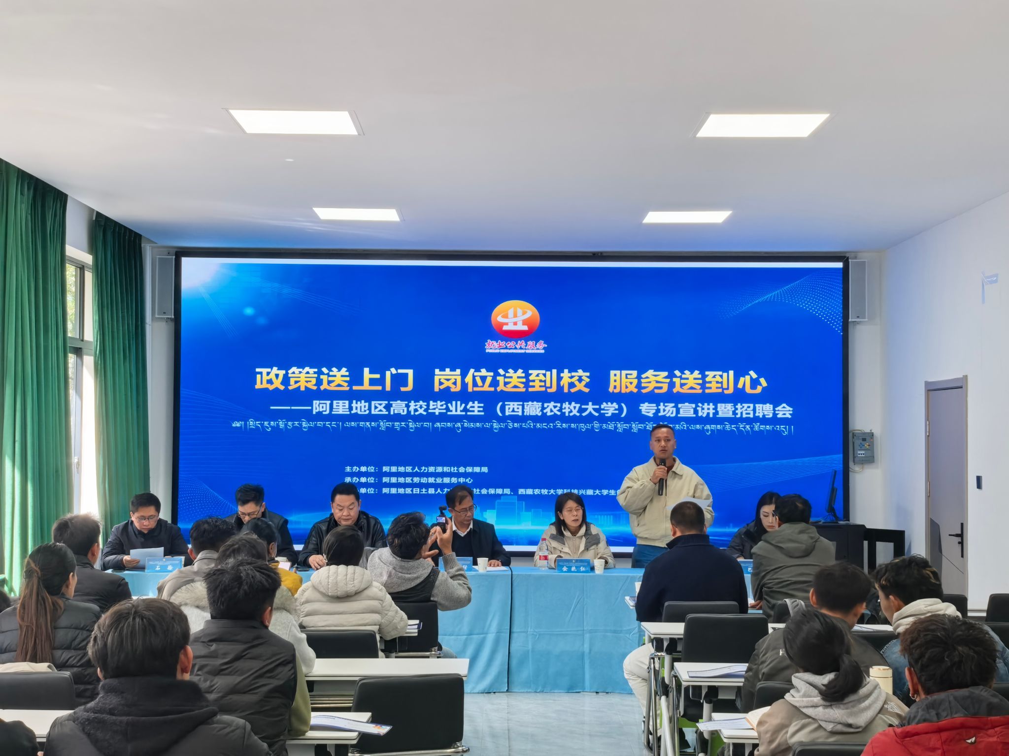 会上,阿里地区人社局就业中心副主任格桑多吉围绕职业发展开展分析与就业引导,帮助毕业生明晰职业方向、树立正确职业认知。随后阿里地区人社局日土县就业中心副主任巴桑详细解读了自治区及阿里地区毕业生就业创业扶持政策。
