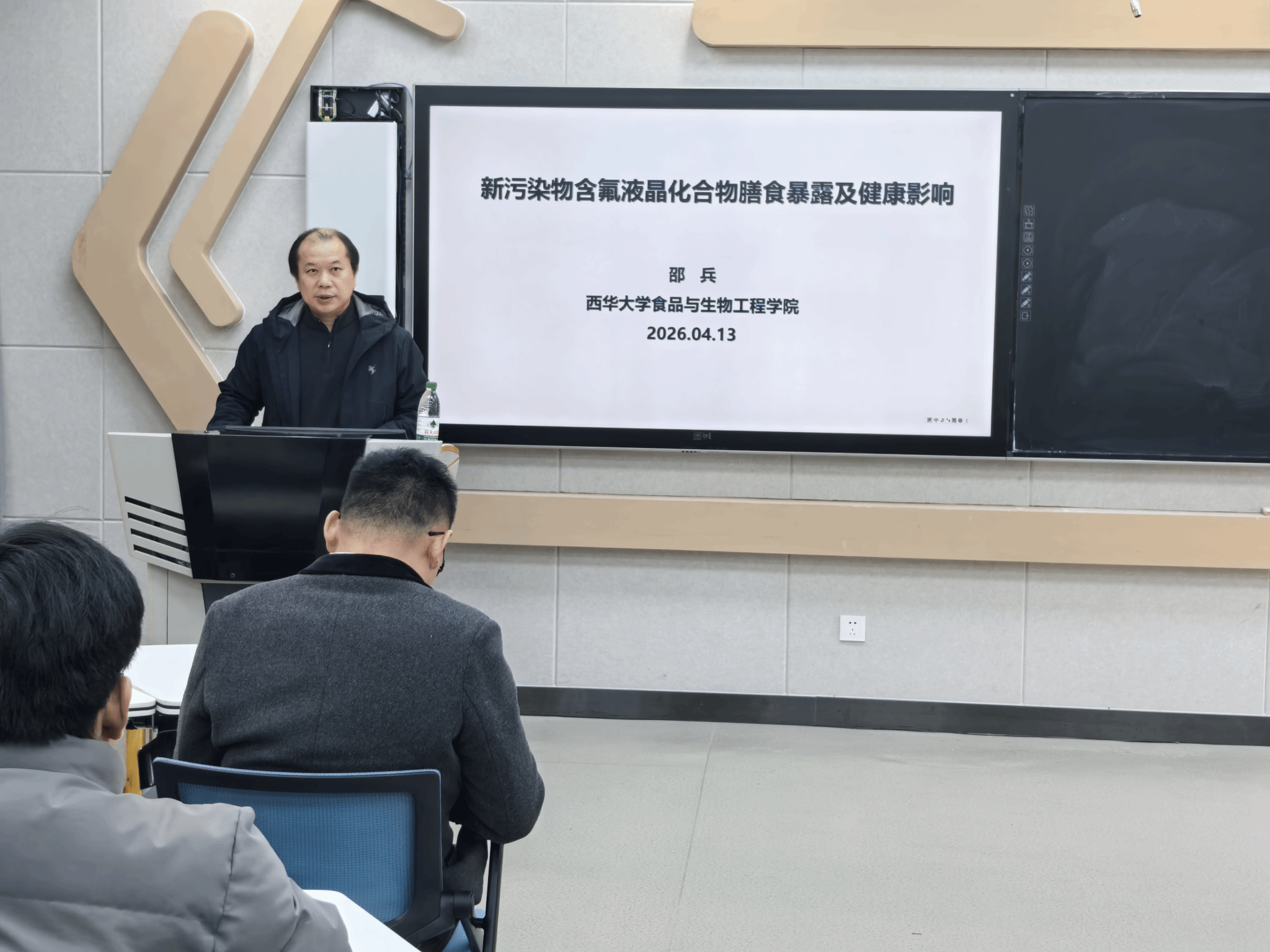 2026年4月13日下午,西华大学食品与生物工程学院二级研究员、国家“万人计划”科技创新领军人才、博士生导师邵兵应邀来校,为食品科学学院全体教师及研究生作题为“食品中新污染物—氟代液晶化合物膳食暴露风险和健康效应”的专题学术报告。