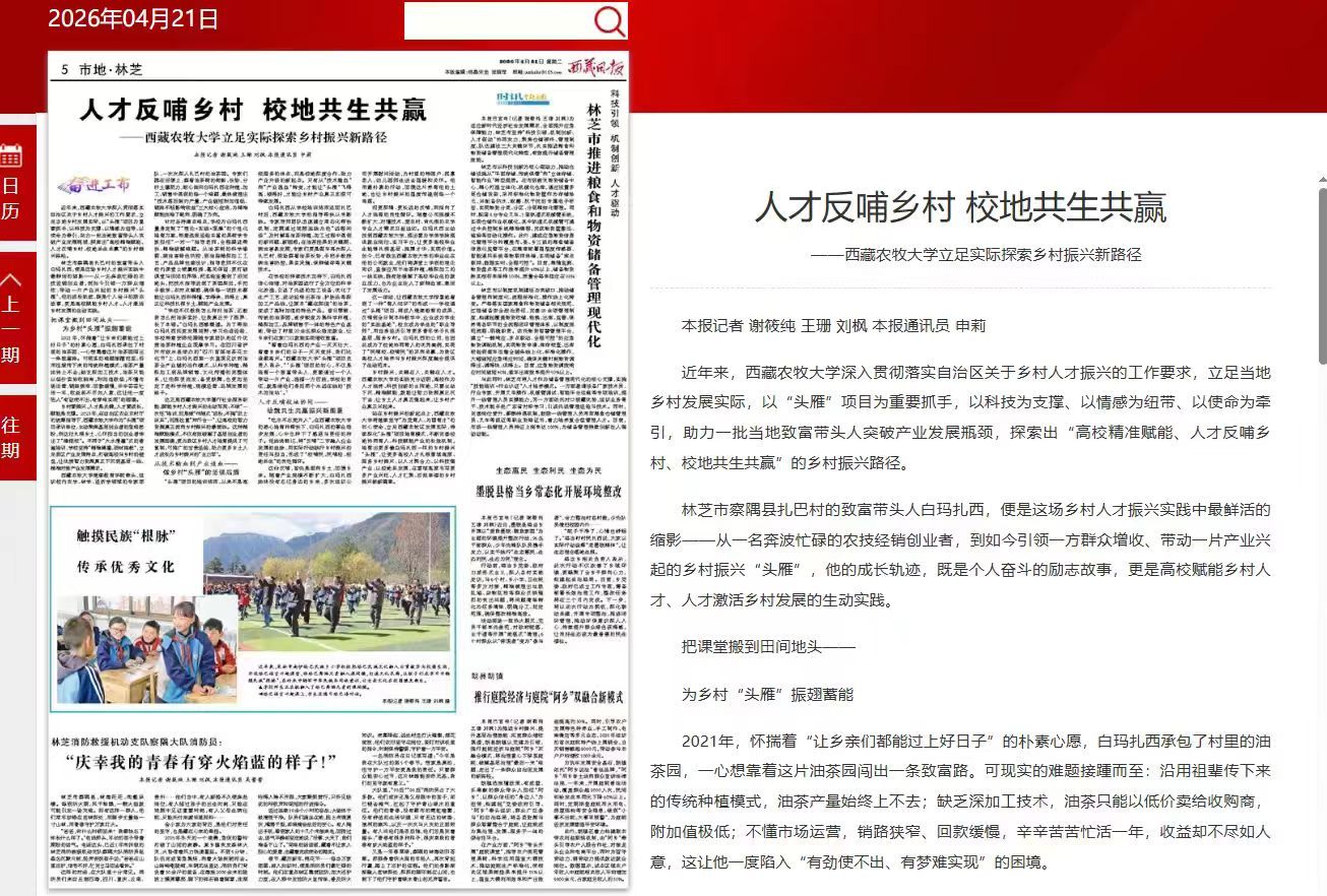 近年来,继续教育学院深入贯彻新时代党的治藏方略,落实自治区乡村人才振兴工作和学校党委决策部署,紧扣“四个创建”“四个走在前列”战略要求,以乡村产业振兴带头人培育“头雁”项目为核心抓手,立足高原农牧产业实际,创新“高校精准赋能、人才反哺乡村、校地共生共赢”工作模式,推动智力资源精准下沉,为西藏乡村全面振兴注入持续动能。同时学校通过“头雁”项目将成人继续教育的成果,反哺到全日制本科教学中,真正实现了“育人闭环”——企业成为学生的“实战基地”,校友成为学生的“职业导师”,形成“民哺校、校哺民”的双向共赢。相关工作成效获《西藏日报》以《人才反哺乡村 校地共生共赢——欧博abg官方网站立足实际探索乡村振兴新路径》为题专题报道肯定。
