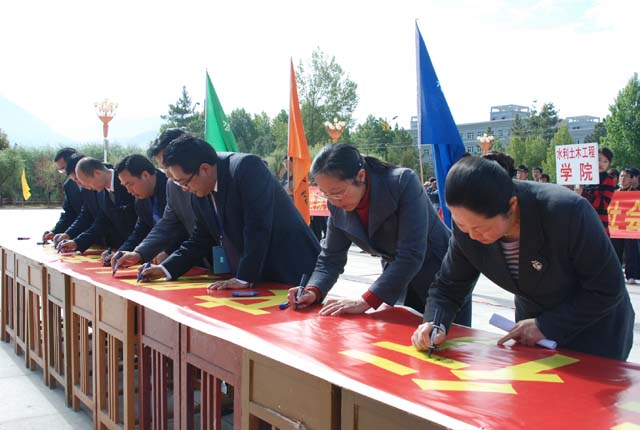 为进一步教育引导我院广大青年学生自觉遵守校纪校规和校园文明公约,全面提升科学文明素质,推进和谐校园、文明校园、生态校园、卫生校园、节约校园建设,营造良好的育人环境,以实际行动迎接中国共产党成立90周年及西藏和平解放60周年,学院决定开展以“爱国爱校、公德先行、文明从我做起”为主题的“推进校园精神文明建设 提升青年学生科学文明素质”活动,该活动是我院迎接中国共产党成立90周年及西藏和平解放60周年系列活动之一。2011年5月7日上午,学院在体育馆广场隆重举行了“推进校园精神文明建设 提升青年学生科学文明素质”活动启动仪式,各职能部门及二级学院党总支主要负责人、学生辅导员及班主任,教师代表,全体团学干部、学生党员参加了启动仪式。院党委委员、副院长周秀英出席启动仪式并讲话。