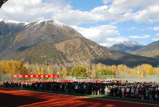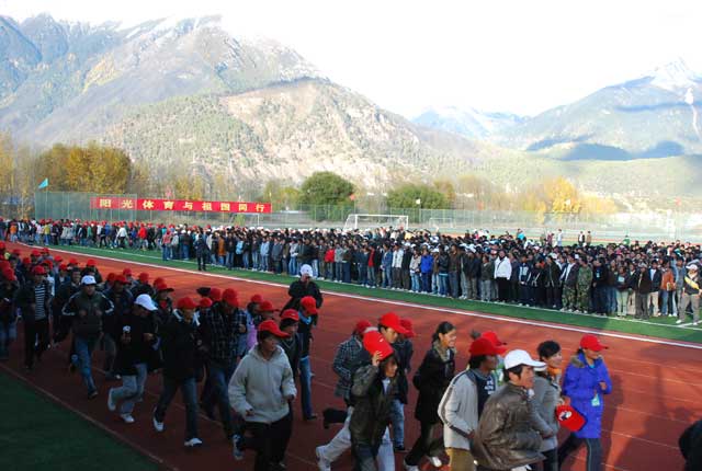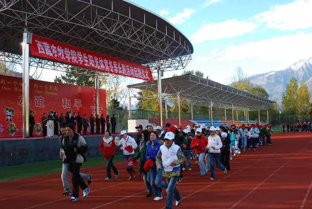 10月29日下午,我院在体育场隆重举行“学生阳光体育冬季长跑活动”起跑仪式,这次长跑活动以“阳光体育与中国同行”为主题,要求每名学生每天早操时间环校园主干道跑3000米,到2009年4月30日完成240公里的里程数。院党政领导桑珠、公曲、周秀英、强巴多吉出席了起跑仪式,学院副院长、阳光体育运动领导小组副组长郑维列同志代表学院作了动员讲话并宣布冬季长跑活动起跑。
