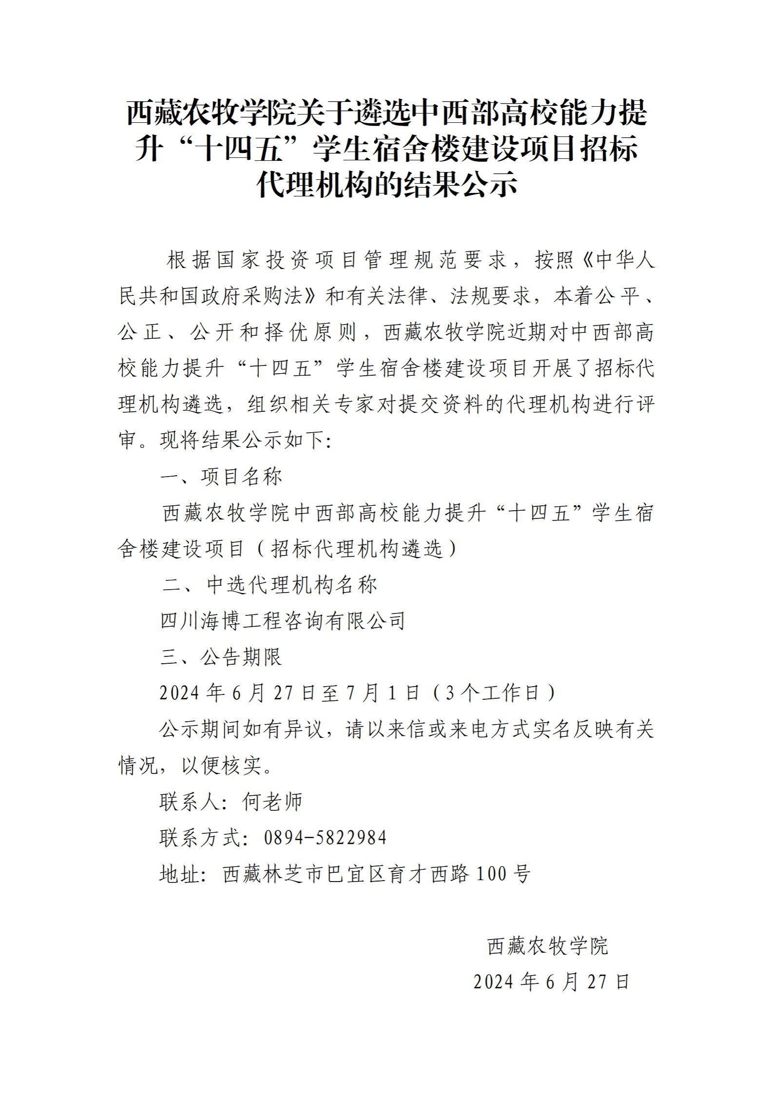 西藏农牧学院关于遴选中西部高校能力提升“十四五”学生宿舍楼建设项目招标 代理机构的结果公示
