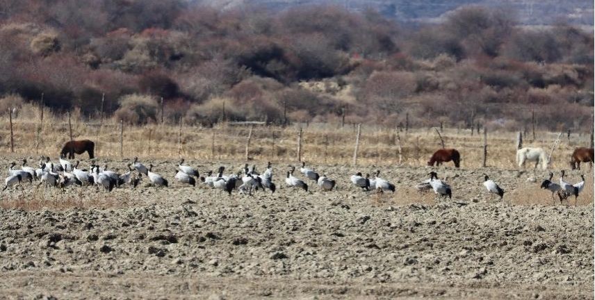 农田中觅食的黑颈鹤(Grus nigricollis)