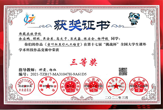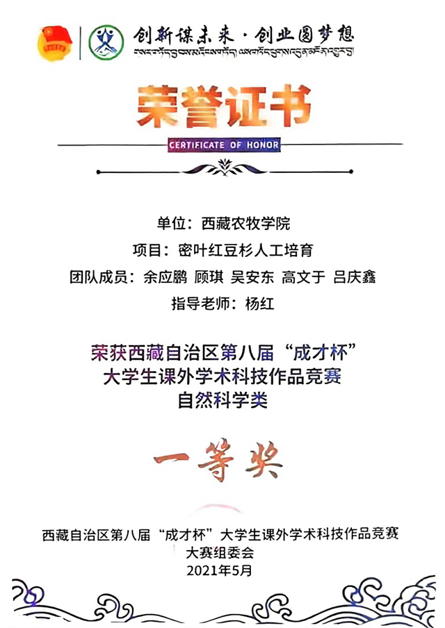 早在2020年9月30日,习近平总书记在联合国生物多样性峰会上就已经提出“生物多样性既是可持续发展基础,也是目标和手段”,党的二十大报告再次强调“尊重自然、顺应自然、保护自然,是全面建设社会主义现代化国家的内在要求”。为树立大学生“人与自然和谐共处”的生态观,培养立志西藏自治区“创建国家生态文明高地,努力做到生态文明建设走在全国前列”的专业人才;资源与环境学院将学生的专业知识与科研兴趣相结合,鼓励学生大胆假设、勇于创新。近5年来,针对两种红豆杉的研究已申报国家级大学生创新项目4项,大学生实训项目2项;发表学术论文5篇,申报实用新型专利1项;2021年《密叶红豆杉人工培育》获自治区第八届“成才杯”大学生课外学术科技作品竞赛自然科学类一等奖,同年该作品获第十七届“挑战杯”全国大学生课外学术科技作品竞赛国赛三等奖;2023年《两种西藏原产红豆杉苗期栽培特性研究》获自治区第九届“成才杯”大学生课外学术科技作品竞赛自然科学类学术论文制作特等奖,现已推送参加第十八届“挑战杯”全国大学生课外学术科技作品竞赛国赛。