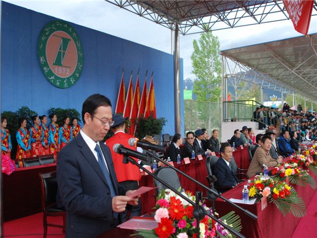 29日上午9:30,伴随着14个方队迈着整齐矫健的步伐一一入场,运动会开幕式正式开始,随后,举行了庄严的升国旗唱国歌仪式。戴华鹏同学、吕光东老师分别代表运动员、裁判员庄严宣誓。院党委委员、副院长,运动会组委会副主任赵垦田致开幕词。院党委副书记、院长,运动会组委会主任次旦平措宣布运动会开幕。学院党政领导、全院5000多名师生员工及林芝地区军分区、林芝地区行署、林芝地区教育局等15个单位的应邀嘉宾参加开幕式。
