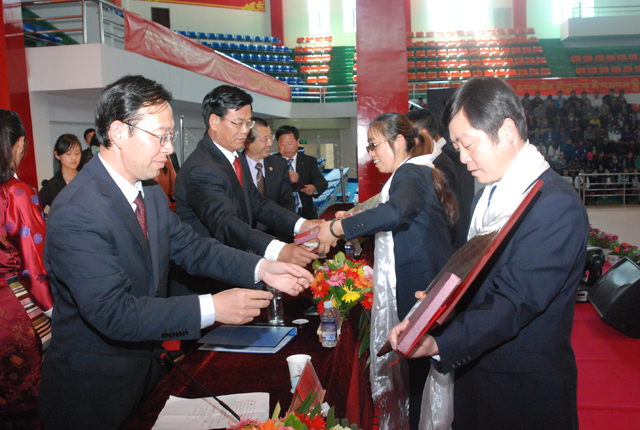 表彰大会在庄严的国歌声中拉开序幕。院党委委员、纪委书记谢金川同志首先宣读了《关于表彰学校2012年民族团结进步模范集体和模范个人的决定》。旺姆老师和王培同学分别代表获奖教师和获奖学生发言。