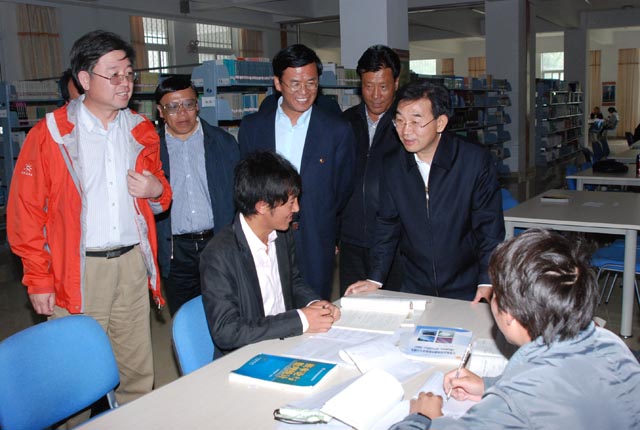 在图书馆,与学生亲切交谈,询问学习和生活情况