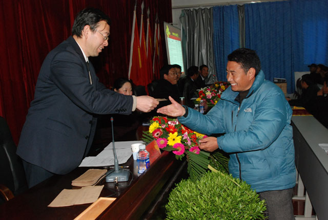 桑珠书记为荣获科学技术奖励的人员及荣获科研先进集体奖的单位颁奖