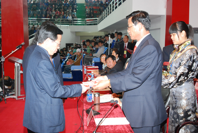 大会在庄严的国歌声中开幕,院党委委员、纪委书记公曲,院党委委员、副院长强巴多吉,院党委委员、教务处处长赵垦田,院党委宣传部副部长、团委书记赵德军分别宣读了《关于表彰2009—2010学年学生工作综合考评先进单位的通知》、《关于表彰2009—2010学年优秀辅导员和优秀班主任的通知》、《关于表彰2009—2010学年先进集体和先进个人的通知》和《关于表彰2010年暑期三下乡社会实践活动先进集体和先进个人的通知》。之后,在校生代表、新生代表及教师代表先后发言。