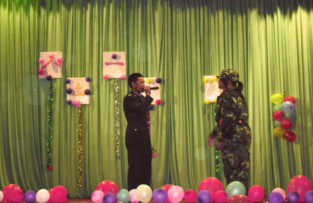 为庆祝建军八十三周年,2010年7月31日晚上,我院在大礼堂举行了“庆八一 立壮志”专场文艺晚会。院党委委员、副院长周秀英,林芝县人武部副部长、学院2009级军训营营长刘运章等同各二级学院分管学生工作领导及全体参训学员1100余人观看了演出。