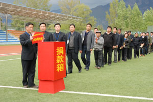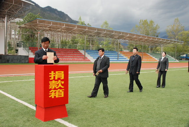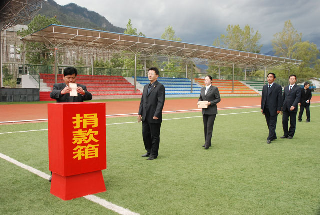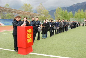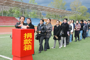 在捐款仪式上,学校领导发表讲话,号召全校师生员工大力弘扬“一方有难,八方支援”的传统美德,发扬人道主义精神,身怀感恩之心,积极向玉树灾区人民伸出援助之手,献上一份爱心,以实际行动支持灾区人民战胜地震灾难,重新建立美好家园。大家坚信,有以胡锦涛同志为总书记的党中央的坚强领导,有优越的社会主义制度,有全国各族人民的大力支援,灾区人民一定能够战胜困难,尽快恢复生产,重建家园。