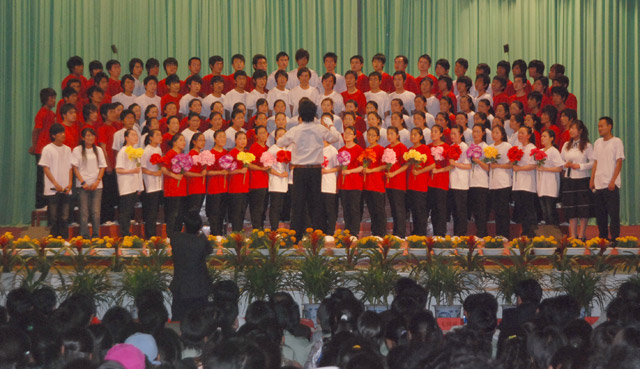 在各班级、各二级学院、各单位开展活动的基础上,6月25、26日我院组织开展了“祖国万岁”---歌唱伟大祖国 喜迎六十华诞大型歌咏比赛,学校千余名师生同台参与了比赛。来自4个二级学院的学生代表队和教职工代表队共12支合唱队饱含激情,唱响了歌颂祖国,缅怀岁月的一支支颂歌。《在希望的田野上》、《没有共产党就没有新中国》、《中国、中国鲜红的太阳永不落》等或优美、或雄壮的歌声回响在校园。随着比赛的不断推进,精彩一浪高过一浪,台下的掌声和台上雄壮的歌声相呼应,使现场的气氛澎湃激昂。