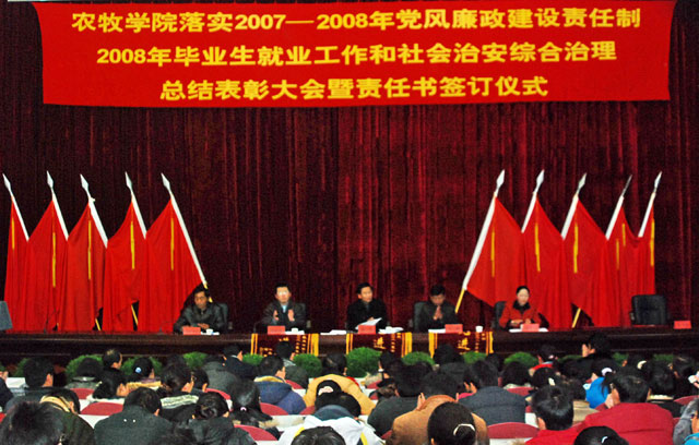 12月27日下午,我院在学术报告厅召开落实2007—2008年党风廉政建设责任制、2008年毕业生就业和社会治安综合治理工作总结表彰大会暨责任书续签仪式。大会由院党委委员、纪委书记公曲同志主持。