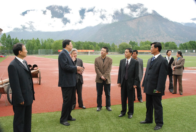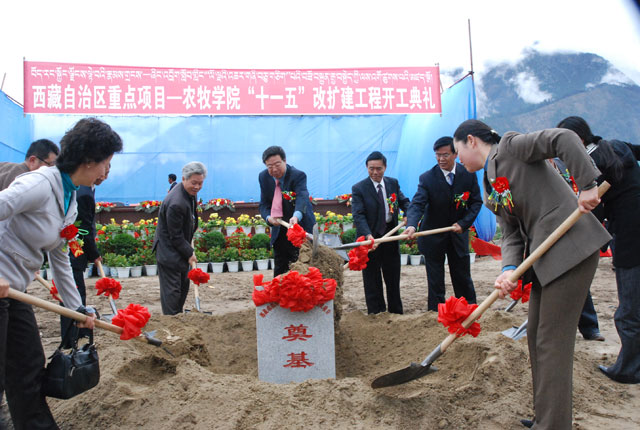 2008年5月18日上午,我院学生区花团锦簇、人颜绽笑,自治区2008年重点项目—— “十一五”改扩建工程开工典礼在这里隆重举行。自治区党委常委、人民政府常务副主席吴英杰,自治区教育厅厅长宋和平,自治区发改委副主任何本云,林芝地委副书记、行署常务副专员李宏,自治区发改委社发处副处长索朗卓嘎,自治区教育厅计财处处长吴爱珍,自治区教育厅基教处处长陆世成,林芝地委副秘书长黄世荣,林芝行署副秘书长丁惠霞等领导莅临典礼现场,到场表示祝贺的还有林芝地区发改委、建设局、消防支队、气象局、环保局等单位领导。学院领导、县处级干部、项目承建单位代表和施工人员参加了开工典礼。