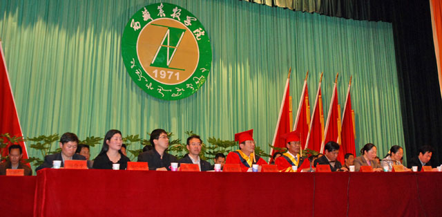 院党委书记、副院长桑珠作了热情洋溢的讲话,他代表学院党委行政向圆满完成学业的2008届毕业生表示热烈的祝贺,向辛勤工作的教师员工致以诚挚的问候,并对毕业生提出了几点要求:一要深入学习中国特色社会主义理论体系,努力用马克思主义中国化最新成果武装头脑,把握正确的人生航向;二要坚定政治立场,全力以赴做好反对分裂、维护祖国统一、维护校园和社会稳定工作;三要立志终身学习,实践完善自我,不断增强报效祖国、服务人民的本领;四要爱岗敬业,踏实工作,以积极的态度对待新的人生征程;五要锤炼品格,诚实守信、常怀感恩之心,努力回报祖国、回报母校。