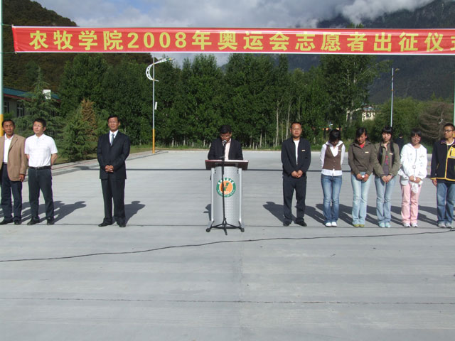 9时30分,欢送奥运会志愿者的出征仪式正式举行,学院党委委员、纪委书记公曲代表院党委、行政向志愿者致欢送辞。他说,奥运志愿者是代表奥林匹克、体现奥林匹克文化、传承奥林匹克精神、奉献奥林匹克事业的形象大使,弘扬奥林匹克精神,践行人文奥运理念,向全世界传递微笑,为百年奥运做出农院人应有的贡献,是我院奥运会志愿者义不容辞、责无旁贷的责任和使命。他要求志愿者一定要坚定政治立场,热爱祖国、热爱党、热爱社会主义;珍惜难得的机遇,树立强烈的责任感与荣誉感,承担起传播奥林匹克精神的神圣职责;为国争光,做好北京奥运会形象大使,在奥运服务期间,服从指挥、团结协作、主动配合;在服务奥运中,相互学习、共同进步,吃苦耐劳、不计得失,主动承担任务,扎实工作,实现服务成长的双丰收。出征仪式上,志愿者代表罗阿珍同学代表志愿者作了发言,她说:“作为一名光荣的奥运会志愿者,我们是北京最好的名片,我们深知,我们不仅代表农院,代表西藏大学生的形象,更代表着13亿华夏儿女,我们一定会牢记职责,不辱使命,倾尽全力奉献汗水与微笑,展示农院学子的热情、善良和自信,向世界人民展现中华民族勤劳勇敢、爱好和平、珍惜友谊的传统美德”。