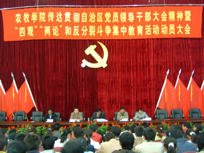 为进一步统一思想、提高认识,全面贯彻落实全区党员干部大会精神,5月29日晚,我院在学术报告厅召开全院党员领导干部大会,传达贯彻自治区党员领导干部大会精神暨“四观”“两论”和反分裂斗争集中教育活动动员大会。学院领导桑珠、公曲、郑维列、周秀英、强巴多吉出席了会议,会议由院党委委员、副院长周秀英主持。