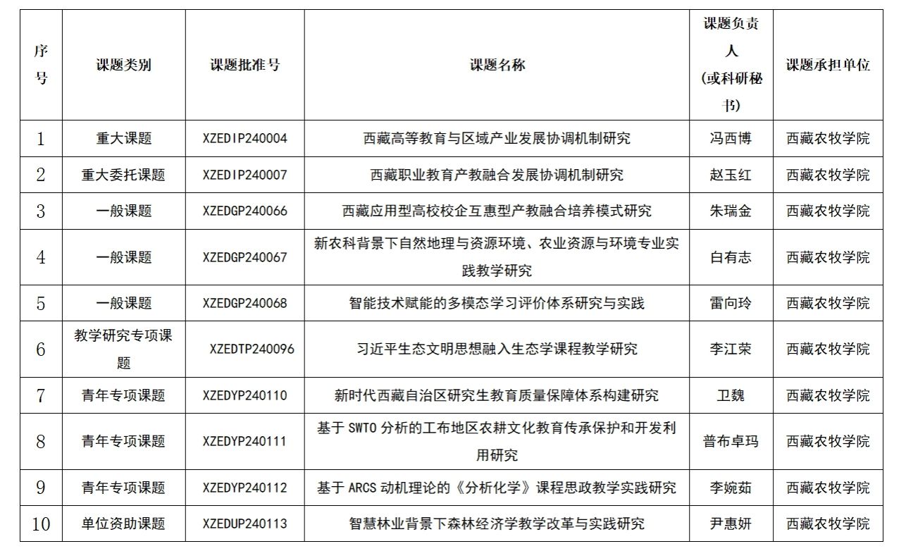 为深入贯彻落实党的二十大和中央第七次西藏工作座谈会精神,深入贯彻落实习近平总书记关于教育的重要论述、关于西藏工作重要指示和新时代党的治藏方略,加快推进教育现代化、建设教育强国、办好人民满意的教育,发挥教育科研工作的支撑、驱动和引领作用,西藏自治区教育科学研究工作领导小组办公室组织13位教育科学研究专家本着公平、公正、严肃的原则对305项申报课题进行评审,经西藏自治区教育科学研究工作领导小组批准,决定对161项课题进行立项。其中,欧博获批立项重大课题1项、重大委托课题1项、一般课题3项、教学研究专项课题1项、青年专项课题3项,单位资助课题1项。