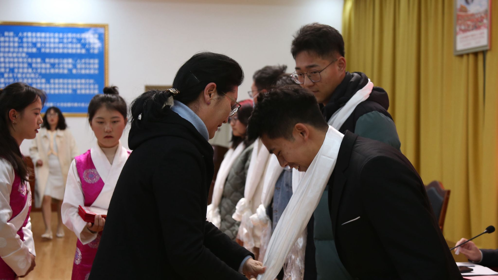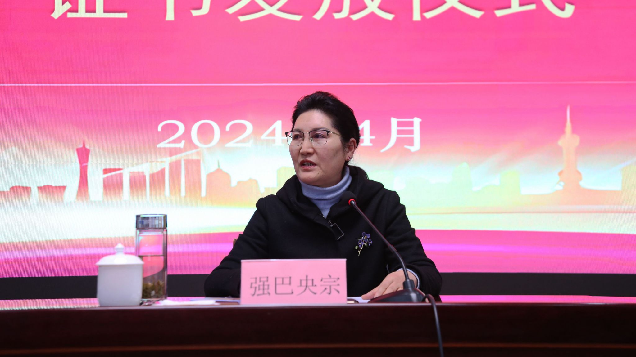 强巴央宗、苏大鹏为获奖学生颁发证书并献哈达。