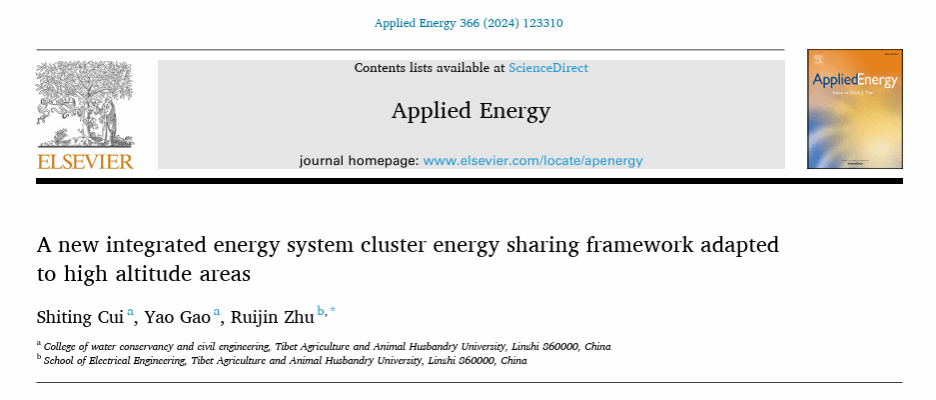近日,朱瑞金副教授团队在能源领域TOP期刊《Applied Energy》上发表题为“A new integrated energy system cluster energy sharing framework adapted to high altitude areas ”的最新研究成果。该文通讯作者为电气工程学院朱瑞金副教授,第一作者为2021级研究生崔世庭,西藏农牧学院为第一作者单位。该研究得到了西藏自治区科技计划项目(JDRC2024000015)、国家自然科学基金项目(52167015)及西藏教育厅重点实验室电气工程实验室的支持。《Applied Energy》是世界能源领域著名学术期刊,在全球出版巨头爱思唯尔 (Elsevier) 旗下,影响因子11.2,CiteScore 21.1,高被引论文ESI全球工程期刊排名第4,列中科院JCR期刊分区一区TOP3%。