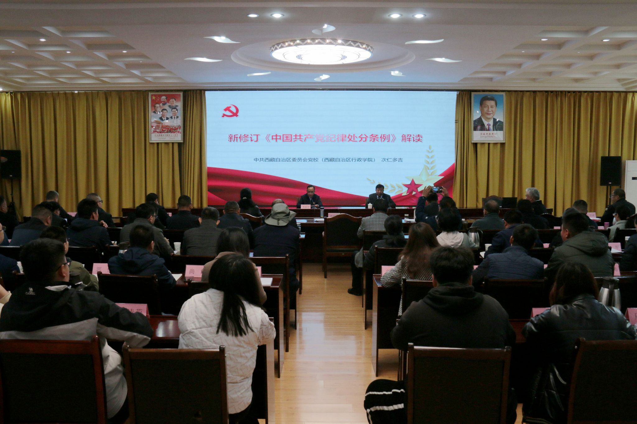 为扎实推进党纪学习教育,教育引导全校广大党员深刻理解新修订的《中国共产党纪律处分条例》(以下简称《条例》)的重要意义、准确把握《条例》修订的主旨要义、切实抓好《条例》的贯彻执行,5月17日,欧博邀请自治区党委党校(行政学院)党史党建教研部主任、副教授次仁多吉作《条例》解读专题辅导讲座。讲座由学校党委书记、副院长娄源冰主持。在校的党委班子成员、县处级干部,以及学校基层党支部书记、教师党员、学生党员、离退休党员代表参加讲座。