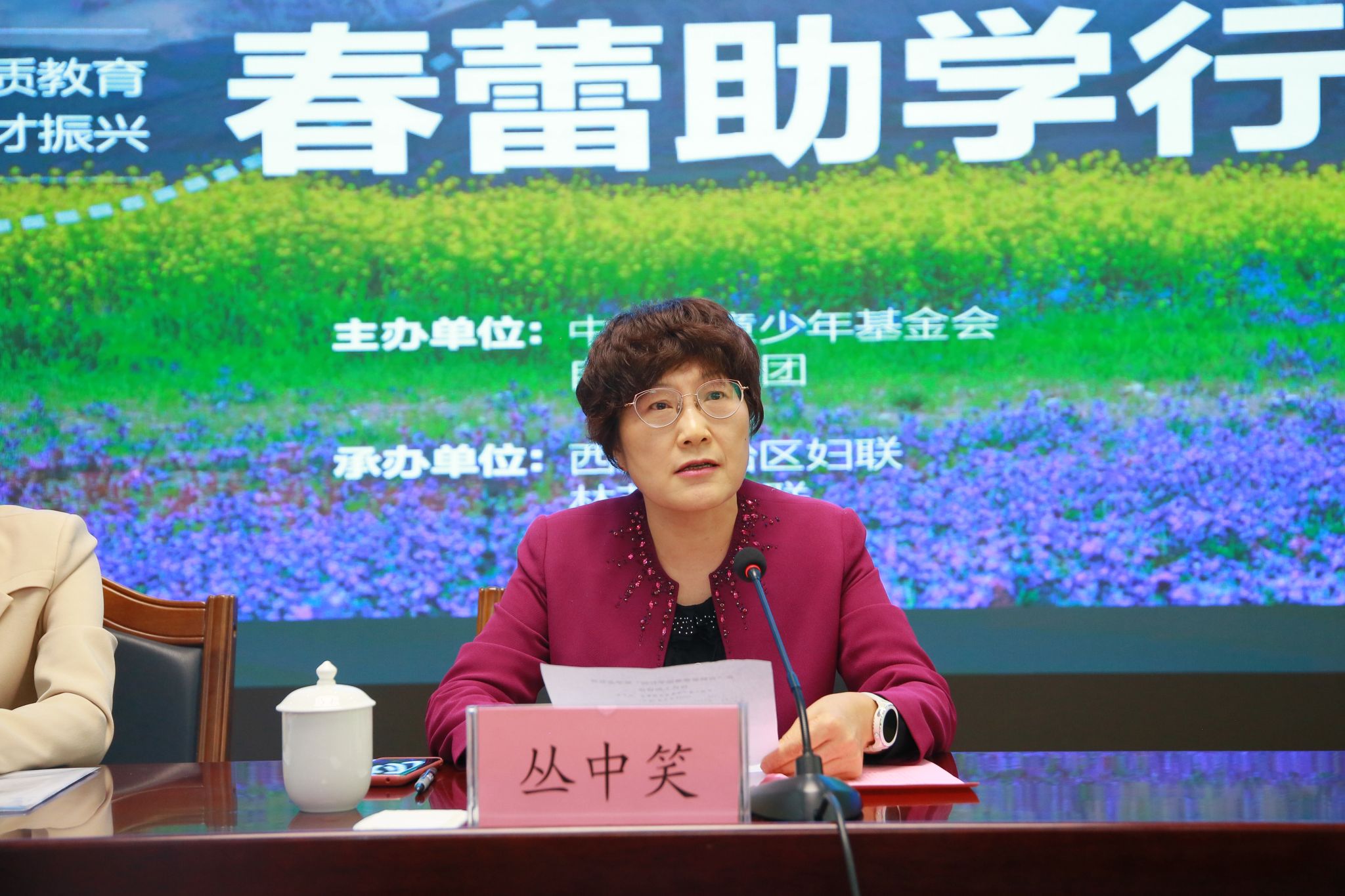 自治区妇联党组成员、副主席次仁央金致辞,她介绍了“春蕾计划”在自治区的实施情况,并对获奖同学提出三点希望:一要志存高远,二要信念坚定,三要心怀感激。希望同学们用实际行动奏响铸牢中华民族共同体意识的乐章,努力成长为德智体美劳全面发展的社会主义建设者和接班人。