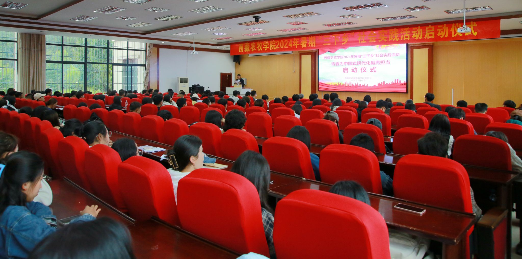 7月10日,西藏农牧学院2024年暑期“三下乡”社会实践活动启动仪式在在研究生苑1号报告厅举行。院党委副书记、副院长苏大鹏,各二级学院(部、所)分管团学工作领导、团总支书记、160名下乡队员代表参加,团委副书记普旺堆主持。
