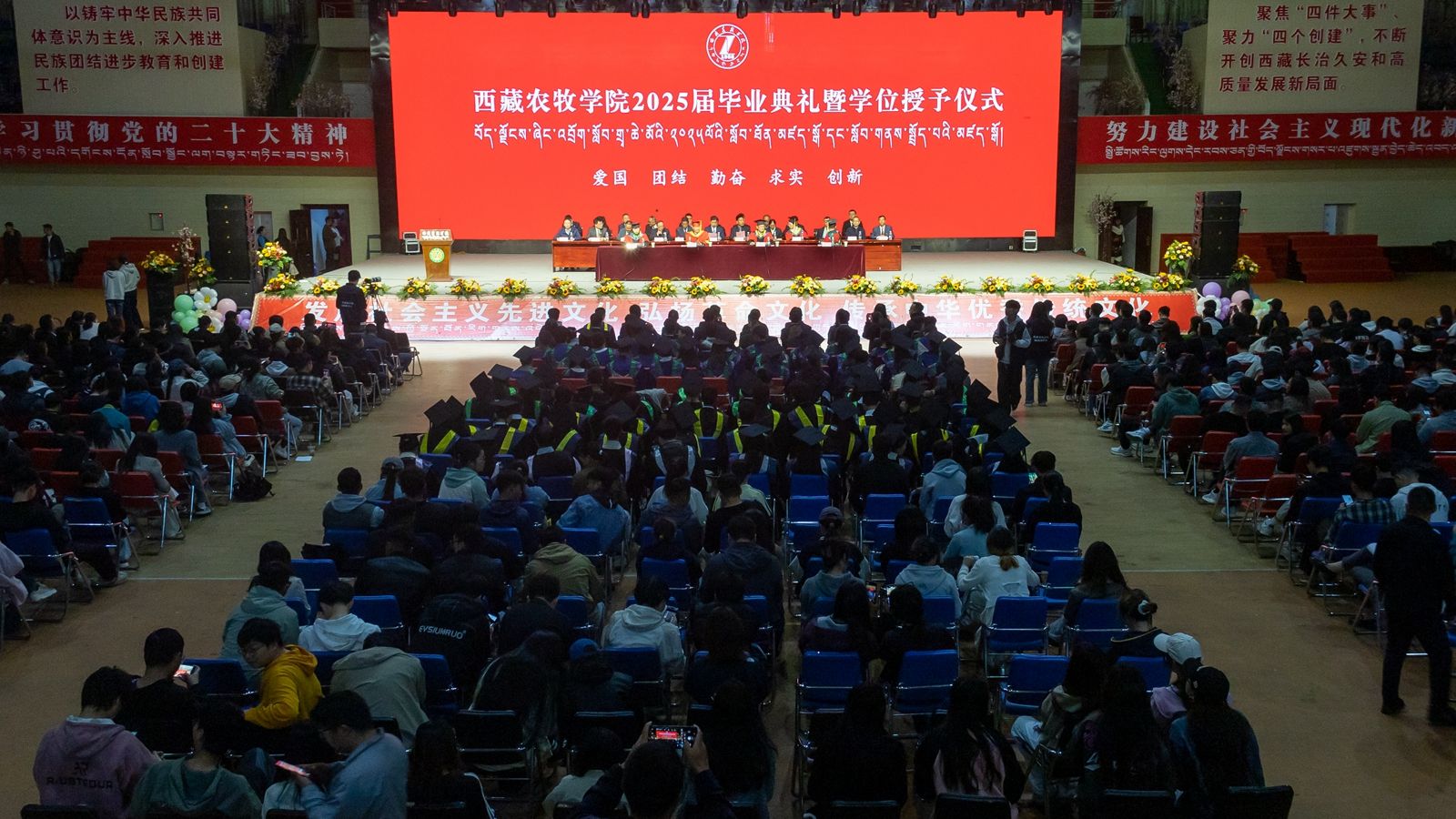 6月16日上午,西藏农牧学院2025届毕业典礼暨学位授予仪式在校文体馆举行。学校党委书记、副校长张兴堂,校党委委员、副校长巩同梁,校党委委员、副校长曹仲华,校党委委员、副校长邢震以及各职能部门、二级学院(部、所)负责人及教师代表、毕业生代表和在校生代表等1200余人共同见证和庆祝1810名本科生和275名研究生顺利毕业。