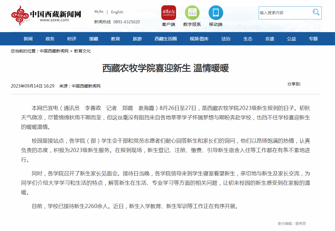 中国西藏新闻网: 西藏农牧学院喜迎新生 温情暖暖