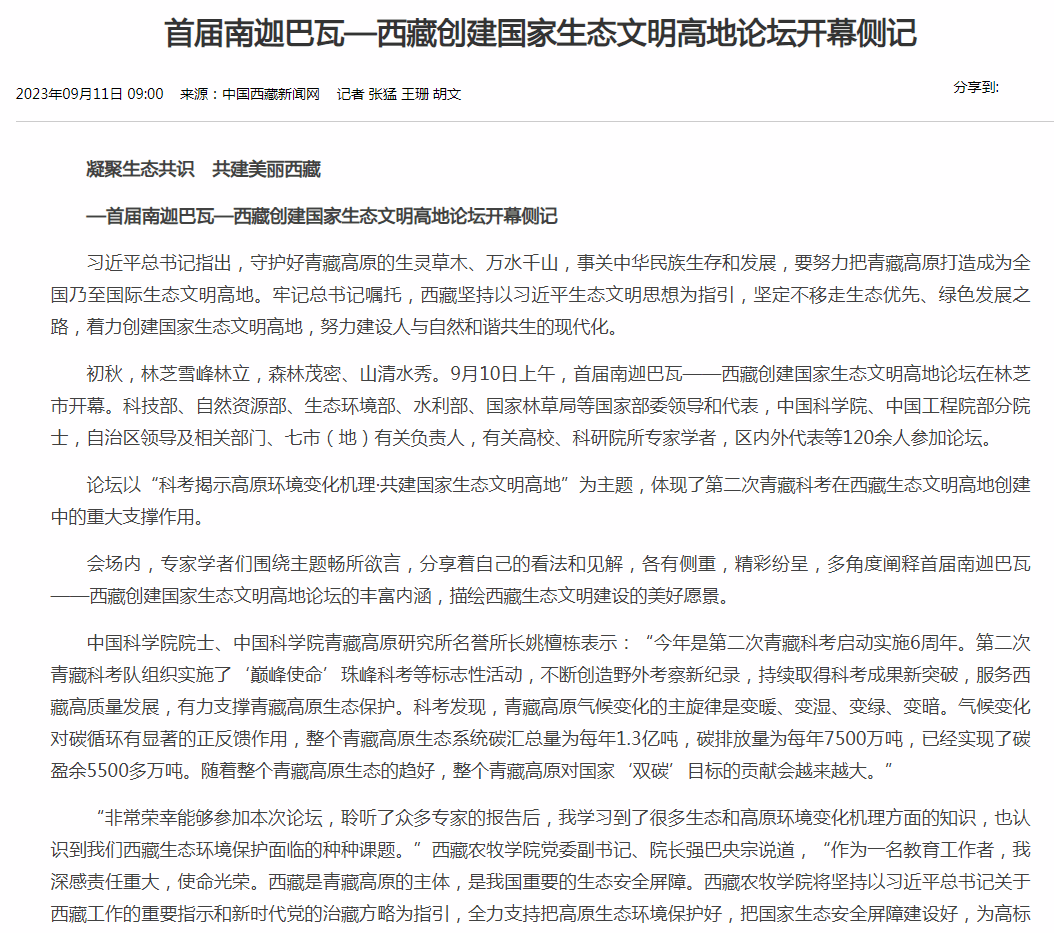 中国西藏新闻网: 凝聚生态共识 共建美丽西藏 —首届南迦巴瓦—西藏创建国家生态文...