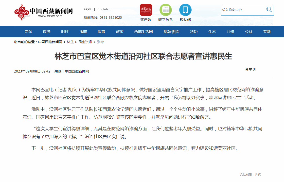 中国西藏新闻网: 林芝市巴宜区觉木街道沿河社区联合志愿者宣讲惠民生