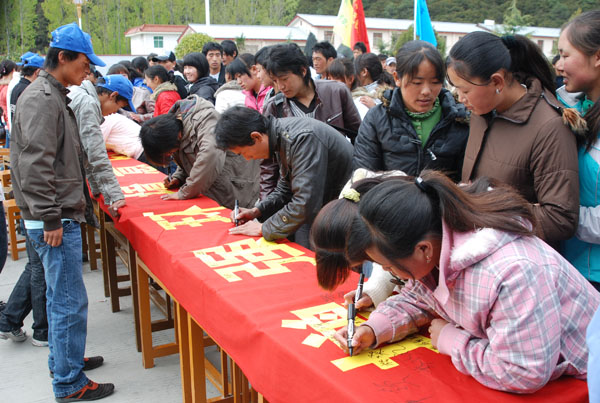 4月19日,我院资源与环境学院举行“增强环境意识、共建美好校园”签名活动 4月19日,我院资源与环境学院举行“增强环境意识、共建美好校园”签名活动 图为青年学生在校园清扫垃圾