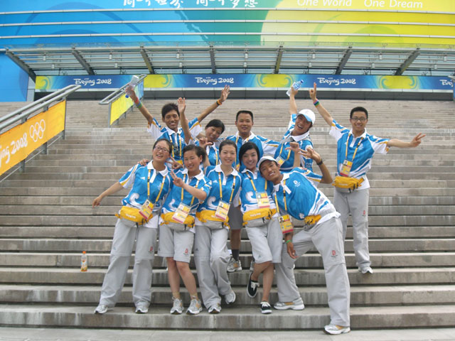 我院的10名奥运会赛会志愿者在北京大学。身后就是他们的服务场馆——北京大学体育馆。奥运会期间,乒乓球比赛将在这里举行。