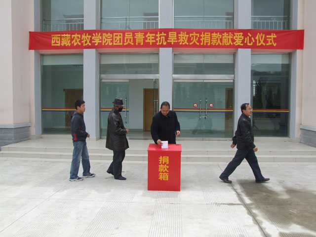 2010年3月30日中午,我院在新行政办公楼前举行全院团员青年抗旱救灾捐款献爱心活动,全院团员青年共3840人参与了捐款献爱心活动,共筹集爱心捐款28900元。这笔捐款将通过林芝地区农行汇往自治区团委基金会,再通...