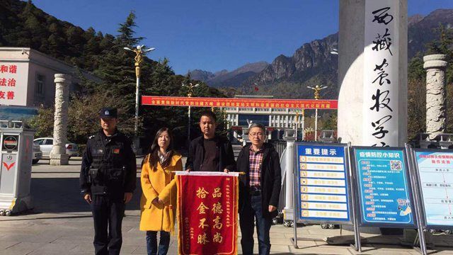 11月13日上午,一失主在民警陪同下,带着一面绣有“拾金不昧,品德高尚”的锦旗来到西藏农牧学院,交到资源与环境学院园林2018级本科班司孟鑫同学的手中,诚挚地向她表示感谢。 11月11日晚司孟鑫同学骑车回...