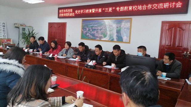 3月18日下午,林芝市科技局、农牧学院科研处召开了党史学习教育暨开展“三更”专题教育校地合作交流研讨会。市科技局党支部书记李莉峰、副局长陈蓉和科研处领导出席,市科技局办公室、高新科、农村科、科协负责人...