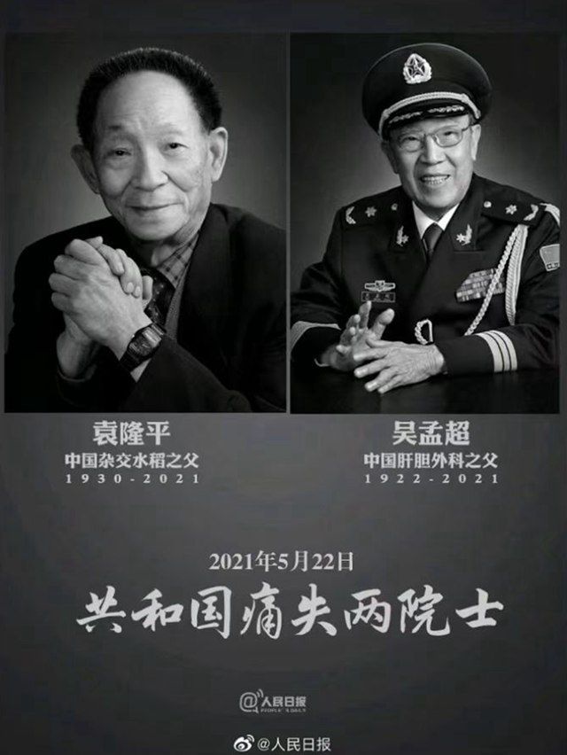 5月22日,中国工程院院士袁隆平,因多器官功能衰竭,在长沙逝世,享年91岁;中国科学院院士吴孟超因病医治无效,在上海逝世,享年99岁。人们为两位院士逝去而悲恸,深情缅怀两位杰出的科学家。 袁隆平院士被...