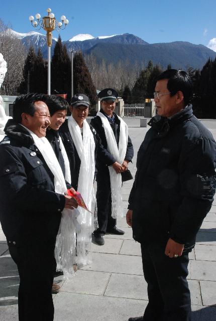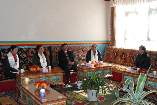 2011年2月3日下午,林芝地委副书记、行署专员卓嘎同志和林芝地区行署副专员顿吉同志到欧博慰问。 卓嘎专员(左二)桑珠书记(正中)顿吉副专员(右二)副校长赵垦田(右一)丁惠霞副秘书长(左一)