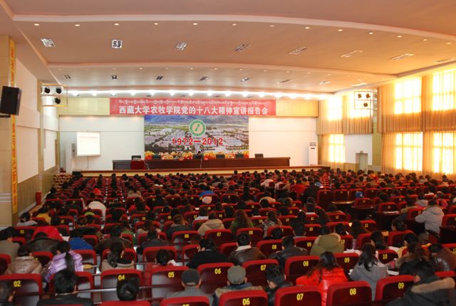 为进一步深入学习宣传党的十八大精神,2012年11月28日上午10时,我院在行政楼会堂隆重举行了党的十八大精神宣讲报告会。全院师生员工和部分学生代表聆听报告。 报告会上,西藏自治区党的十八大精神宣讲团成员...