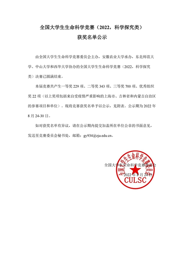 近日,由全国大学生生命科学竞赛委员会主办的全国大学生生命科学竞赛(2022,科学探究类)结果揭晓。本届赛事自2021年7月网络报名至2022年8月全国决赛,历时一年之久,经过竞赛委员会组织的资格审查、网络评选、...