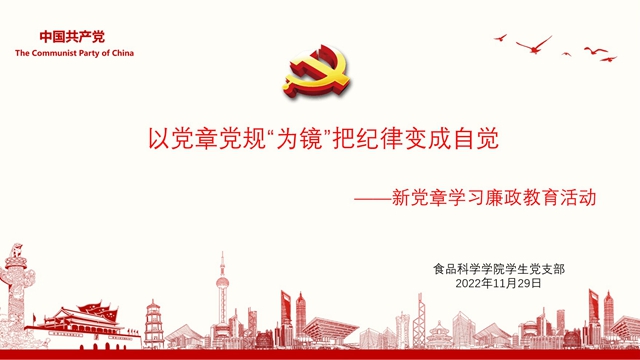 为深入学习贯彻党的二十大精神,深刻理解、全面把握《中国共产党章程(修正案)》的重大意义和重要内容,进一步引导全体党员积极学习党的新理论,严守党的纪律,食品学院食品专业学生党支部于2022年11月29日在食...