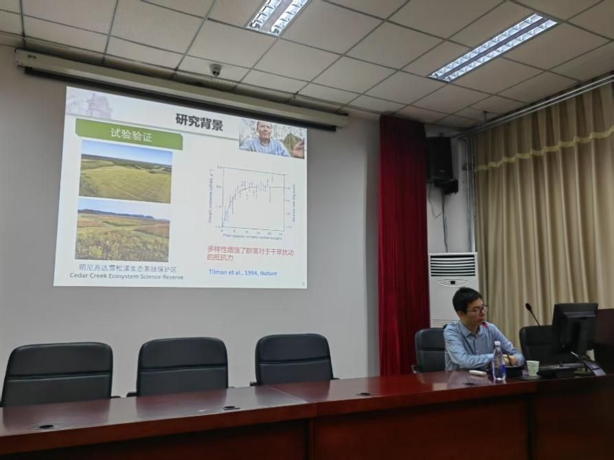 报告会上,赵磊副教授以《多样性与优势种对植物群落时间稳定性的影响机制》为题,结合生态观测数据与统计分析模型,层层递进地剖析了生物多样性与群落稳定性之间的复杂关系。他不仅系统阐释了物种丰富度、均匀度如何影响群落抗干扰能力,还通过案例实证,揭示了优势种在资源分配、结构维持中扮演的关键角色,为理解生态系统动态平衡提供了新视角。在互动环节,师生们围绕 “极端环境下土壤微生物多样性与稳定性”“气候对植物多样性与稳定性的影响”等踊跃提问,赵磊副教授结合自身研究经验,深入浅出地逐一解答,并分享了国际前沿研究动态。