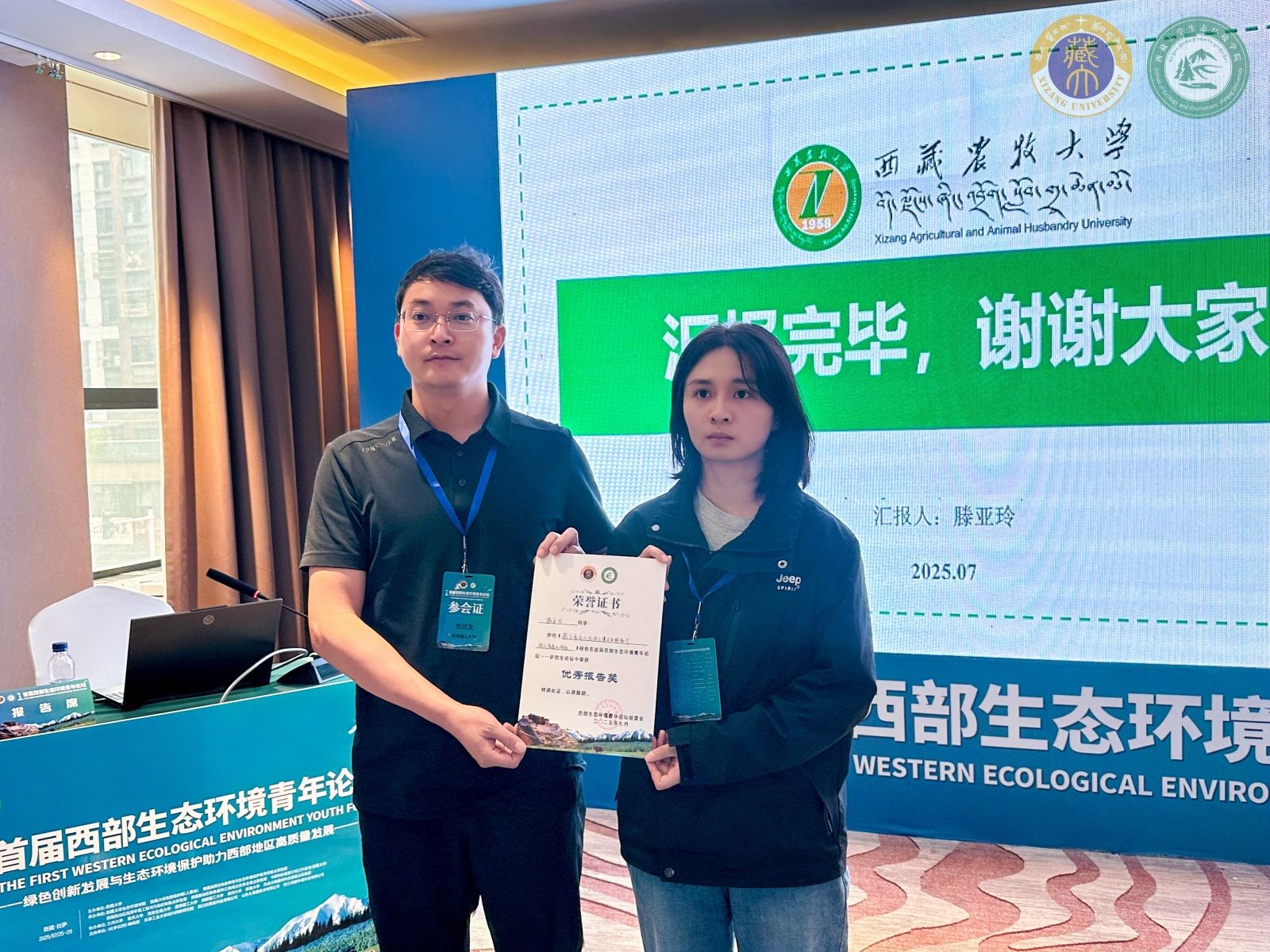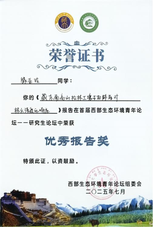 7月25—29日,由西藏大学主办,兰州大学、重庆大学、西安交通大学等西部高校共同协办的“首届西部生态环境青年论坛”在拉萨举行。论坛以“绿色创新发展与生态环境保护,助力西部地区高质量发展”为主题,吸引了来自西部十余所高校的百余名青年学者。资源与环境学院侯磊副教授指导的2023级林学硕士研究生滕亚玲参会,并以《藏东南高山松林土壤生物群落对林火强度的响应》为题作研究生论坛报告,荣获“优秀报告奖”。