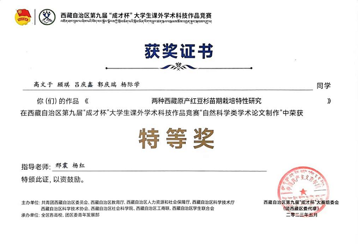 2023年6月2日在西藏自治区第九届“成才杯”大学生课外学术科技作品竞赛暨第十八届“挑战杯”西藏选拔赛决赛中,我院农业资源与环境专业2020级本科班高文于、顾琪、吕庆鑫等同学的《两种西藏原产红豆杉苗期栽培特性研究》一文荣获“自然科学类学术论文制作”特等奖,赢得进入国赛资格。邢震老师荣获西藏自治区优秀指导教师的荣誉称号。该成果受到国家级大学生创新训练项目“西藏两种红豆杉苗期抗寒性筛选”等的资助,对西藏原产的须弥红豆杉(Taxus wallichiana)和密叶红豆杉(Taxus fuana)从扦插繁殖、基质栽培、施肥试验、再到露地栽培等方面进行了较为系统的苗期栽培研究。完成研究论文4篇,其中已见刊和录用待刊3篇,待投1篇。