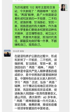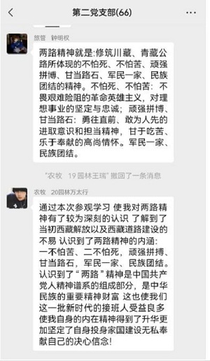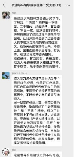 史感践行、修筑两路铸丰碑、五易寒暑变通途、艰苦卓越献忠诚、世界屋脊创奇迹、鱼水情深心连心、综合交通惠民生、雪域江南迎高速、四好路上奔小康、抢险保通展风采、两路精神放光芒”十一个方面的内容讲述70年来,西藏公路人秉承“一不怕苦、二不怕死、顽强拼搏、甘当路石、军民一家、民族团结”的精神,赓续雪域高原红色命脉,使西藏交通从无到有、从小到大、从弱到强的艰辛历程。参观结束后,参展学生以支部为单位分享各自的体会和感受。