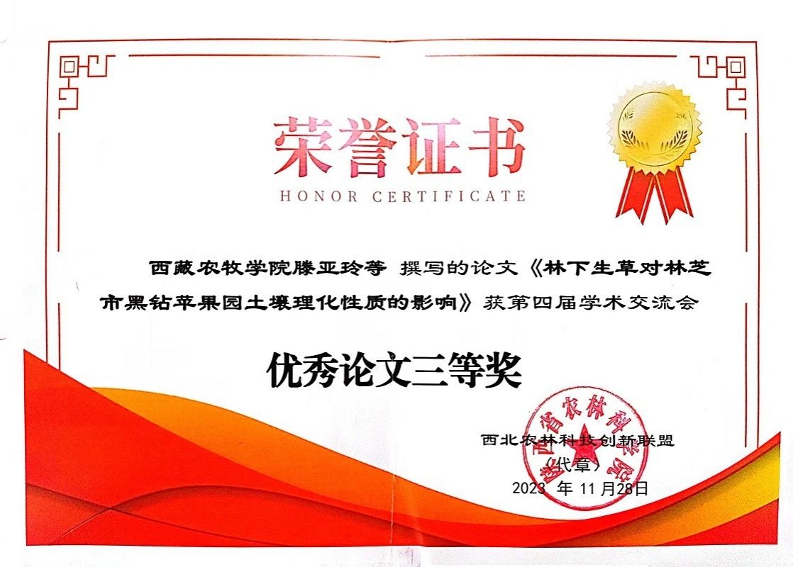 西北农林科技创新联盟是我国西北地区农林科研单位组成的科技联盟,旨在以西北自然资源条件、区域生态环境特征为基础,聚集农业科技优势资源和力量,创新机制、优势互补、资源共享、共赢发展,增强农业科技协同创新与转化应用能力,加强与中亚及阿拉伯国家的农业科技合作与交流,共同服务国家创新驱动发展和“一带一路”战略,推进西北地区农业现代化进程。联盟此次会议主题为“生态文明,绿色发展”,欧博受邀参加。资源与环境学院侯磊副教授指导的林学专业研究生滕亚玲同学投稿的研究论文《林下生草对林芝市黑钻苹果园土壤理化性质的影响》经专家评审,获得会议优秀论文三等奖,并受邀进行了现场学术交流发言。
